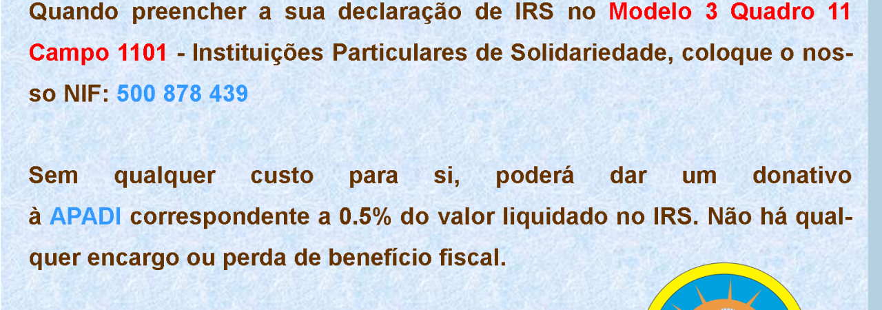 Sem qualquer custo para si, poderá dar um donativo à APADI correspondente a 0.5% do valor liquidado no IRS. Não há qualquer encargo ou perda de benefício fiscal.